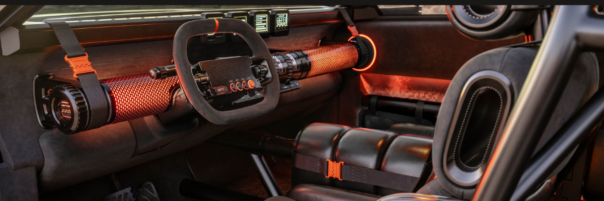 El Interior ofrece un estilo retro de lo más llamativo con zonas en cuero negro y un color naranja casi incandescente haciendo de contraste incluso en elementos anodizados. Dentro hay un puesto de conducción con un volante cuadrado y una pantalla en el centro que de nuevo juega con el estilo pixel. Además está pensado para convivir con botas, arena, arenilla y un buen equipo de acampada y aventura.